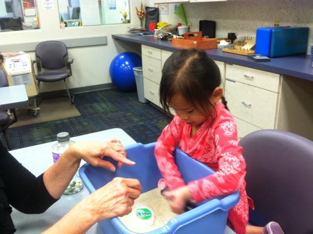 Last week, we began therapy with an OT that specializes in the hand. The girls are quite popular at this facility because all of their patients are typically teens and adults. The first session was a little sketchy. This picture was taken as a bribe to do what she was being asked to do & we would show it to Daddy. Otherwise, she was not real interested in relaxing her elbow to do anything since she's been favoring her arm for so long. We did find out that we could start weaning from wearing the splint, which I think has really helped her to start thinking to use her left hand again.